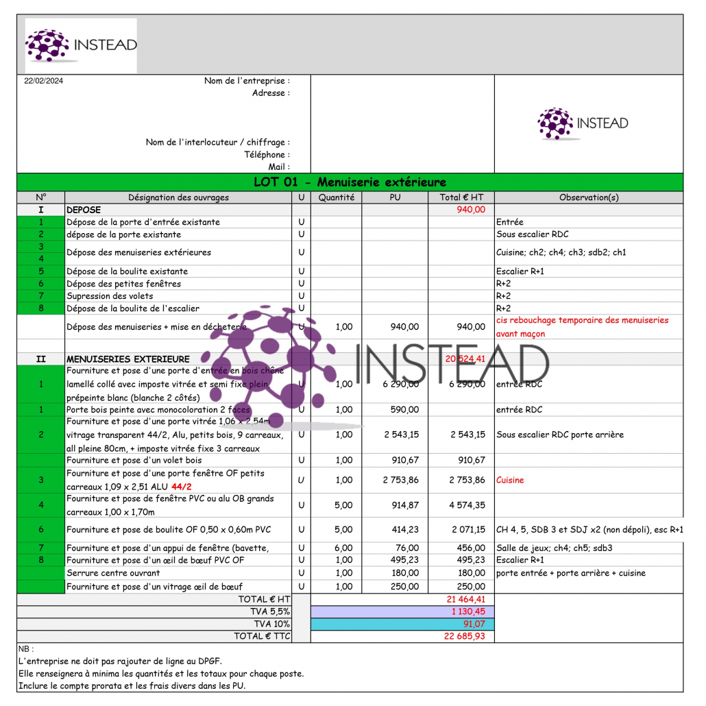 Nous pouvons réaliser pour vous l’appel d’offre auprès des artisans, après élaboration d’un cahier des charges détaillé décrivant précisément les articles dans chaque lot, assortis de plans annotés facilitant la lecture par les entreprises consultées. Une visite sur site s’imposera pour que le chiffrage se fasse au plus près de la réalité.